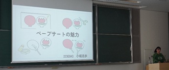 第1回子ども生活学部卒業研究発表会が開かれました 本学では全員が卒業研究に取り組みます。 4月11日に第1回発表会を行い、目的や方法、計画を報告しました。 多様なテーマのもと、12月の完成を目指して取り組みます。 ■関連画像
